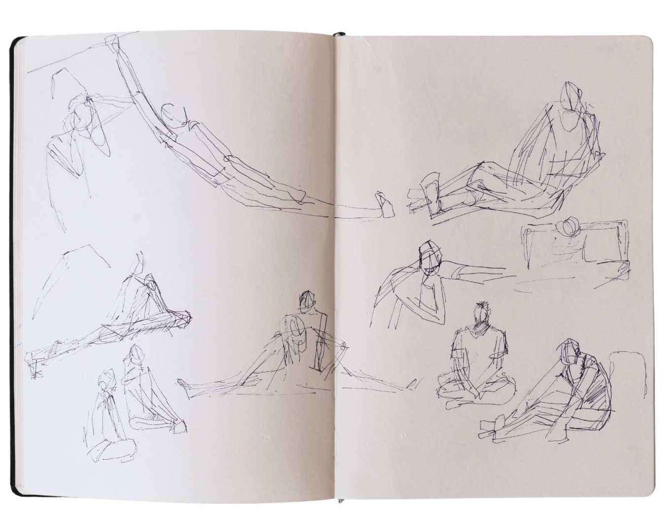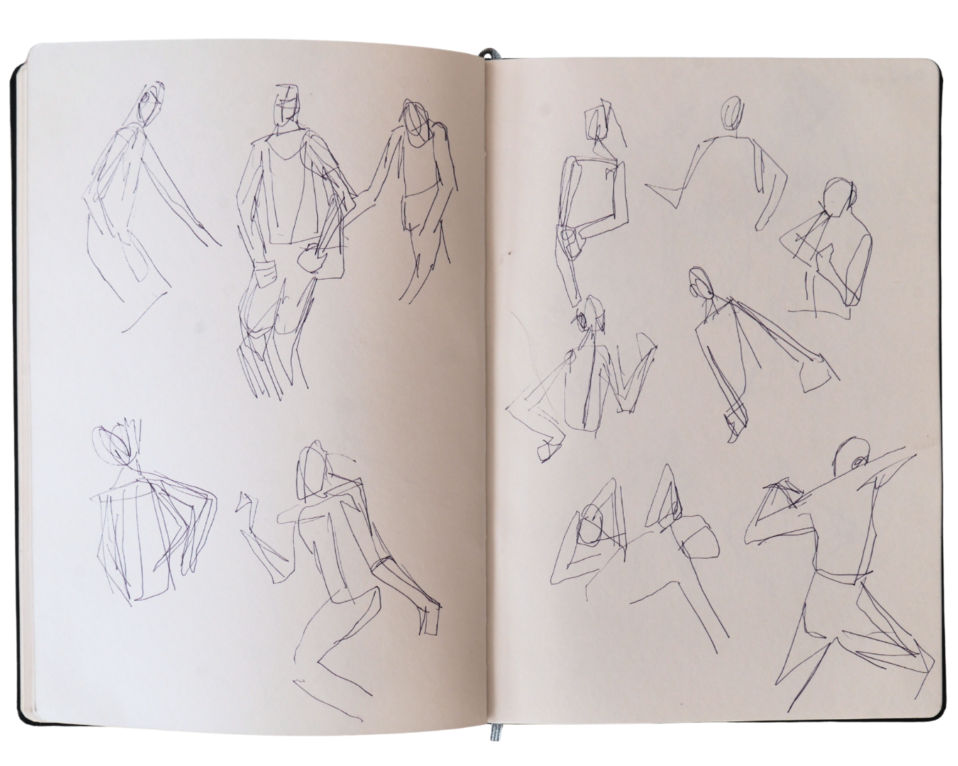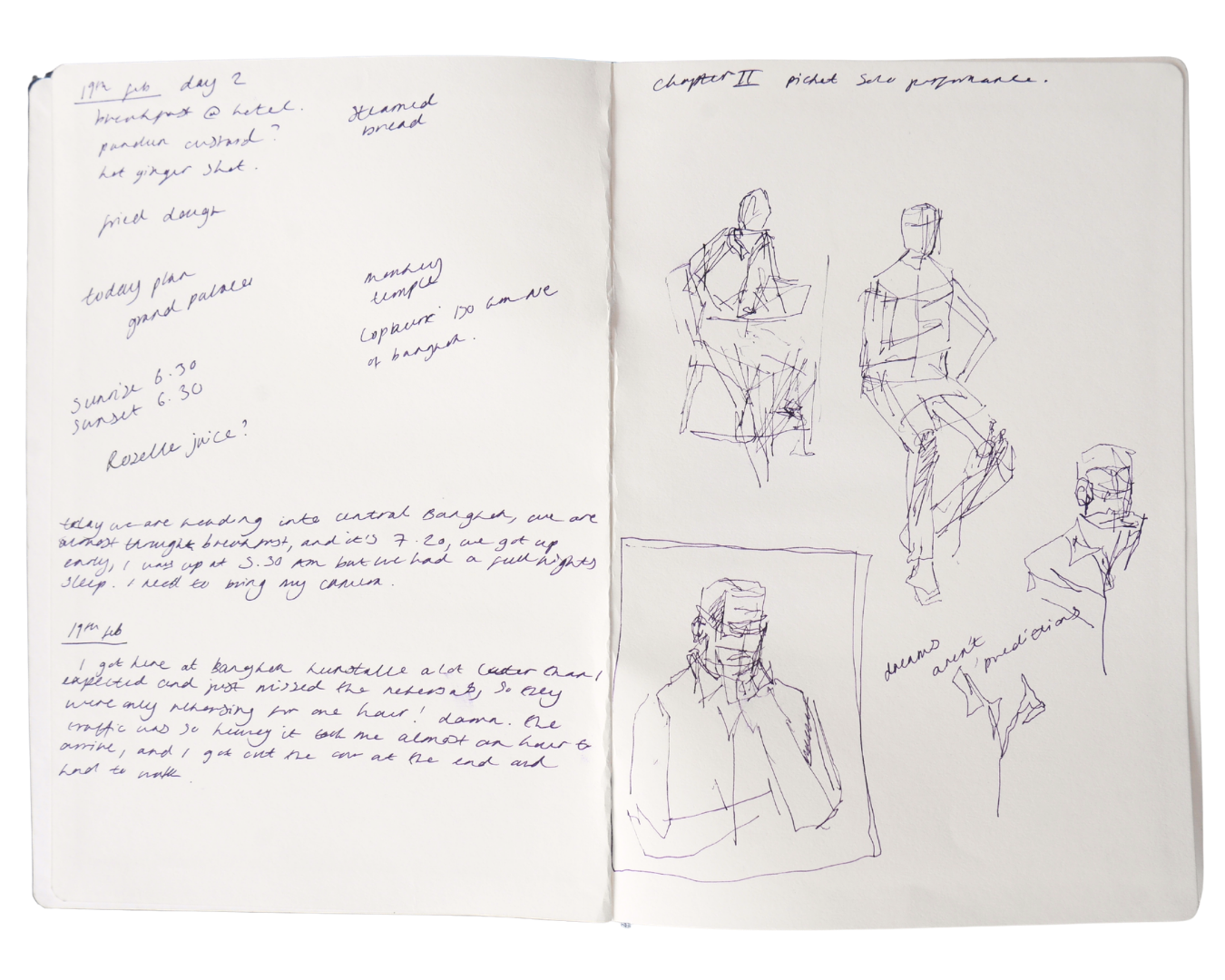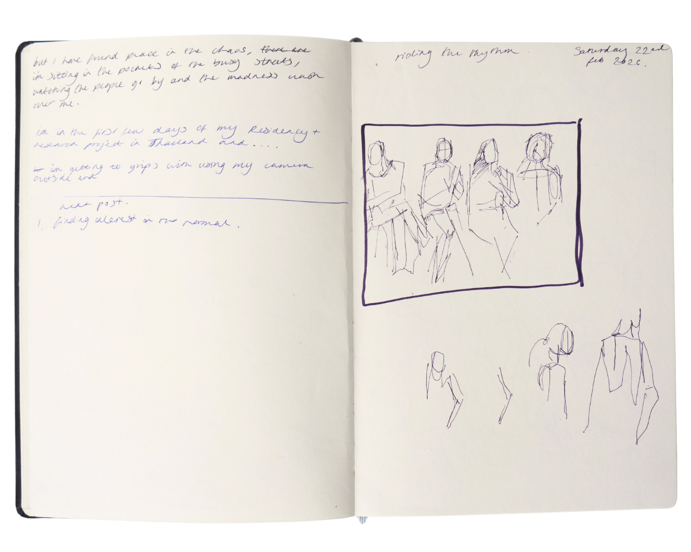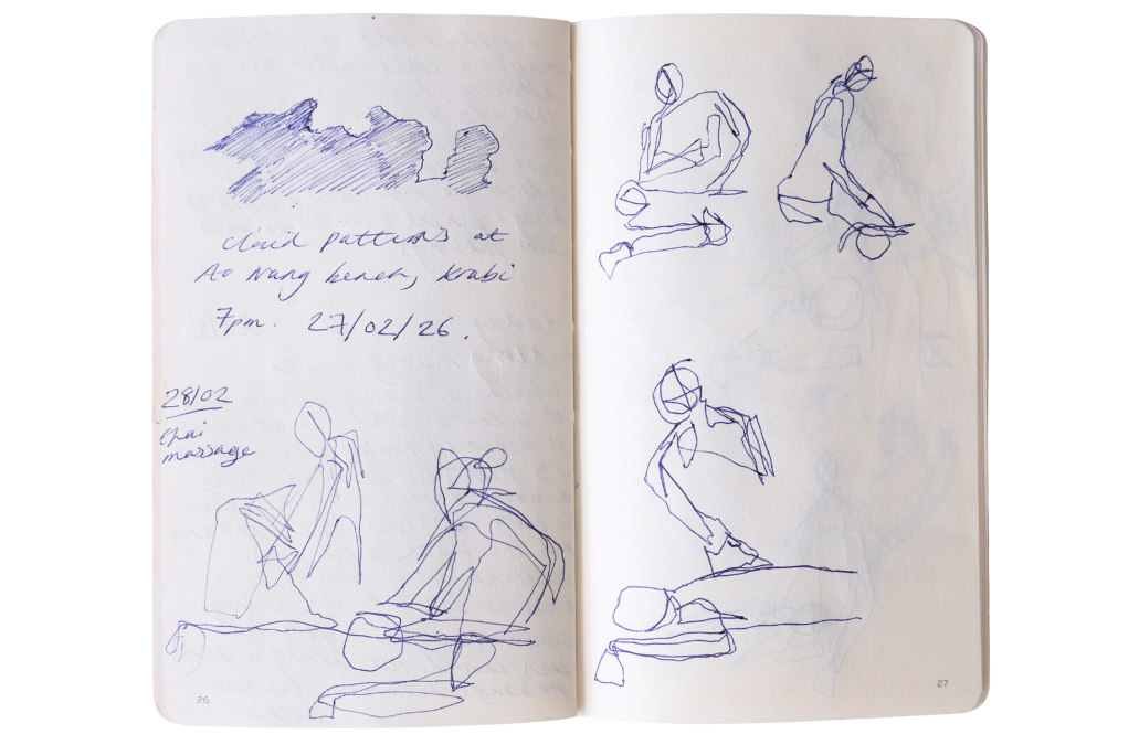 Visiting more places across the country, I drew inspiration from the landscape, culture, food, and customs. Exploring further afield from Bangkok ended up being just as fulfilling as the research project for me to get a better idea of how these elements of dance, theatre and ceremony are visible throughout Thailand. I enjoyed observing traditional Thai massage, something usually only conducted in private spaces, being a communal experience along the coast and in shared rooms. You can see glimpses of my thoughts through my travel sketchbook below.