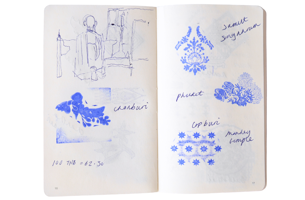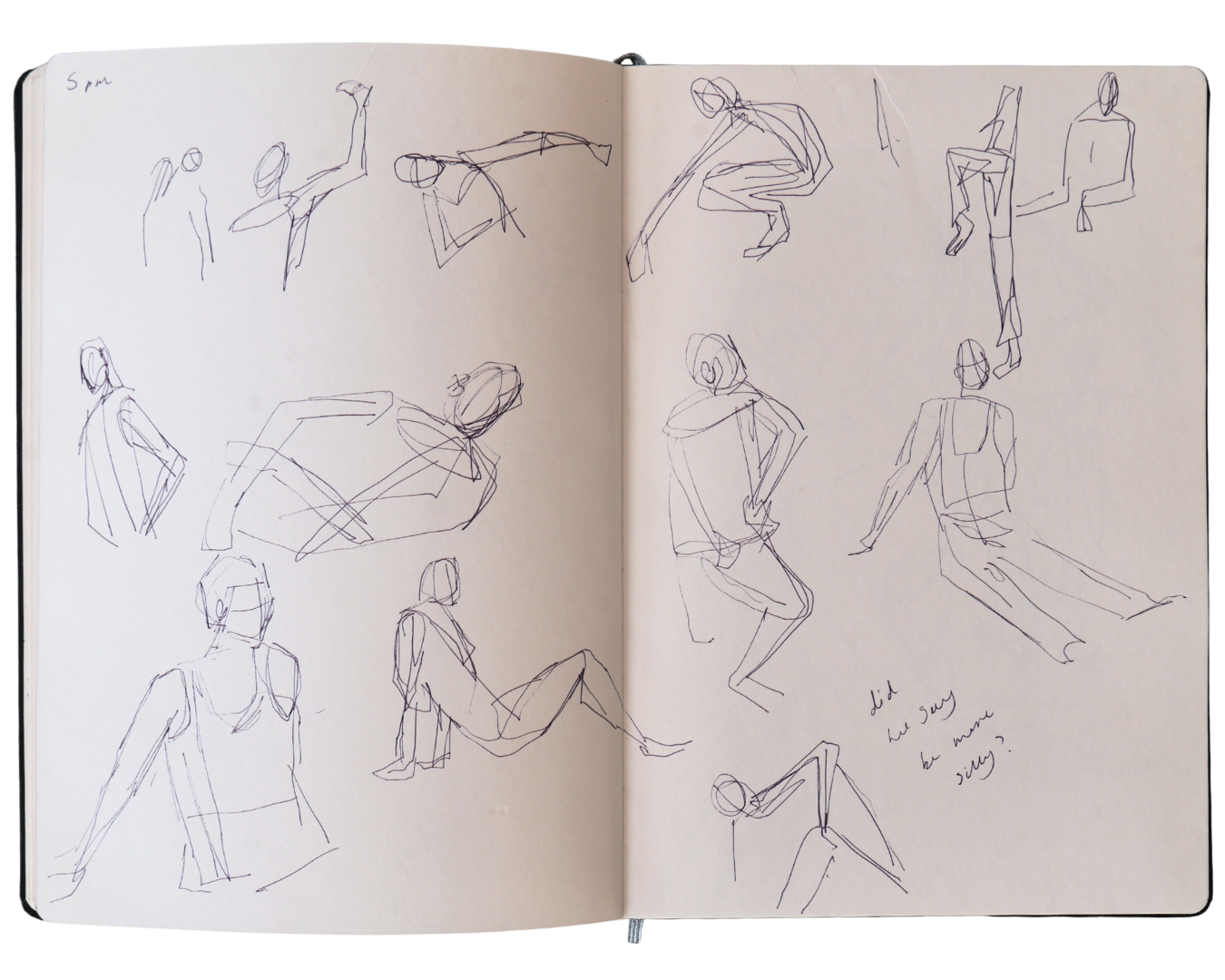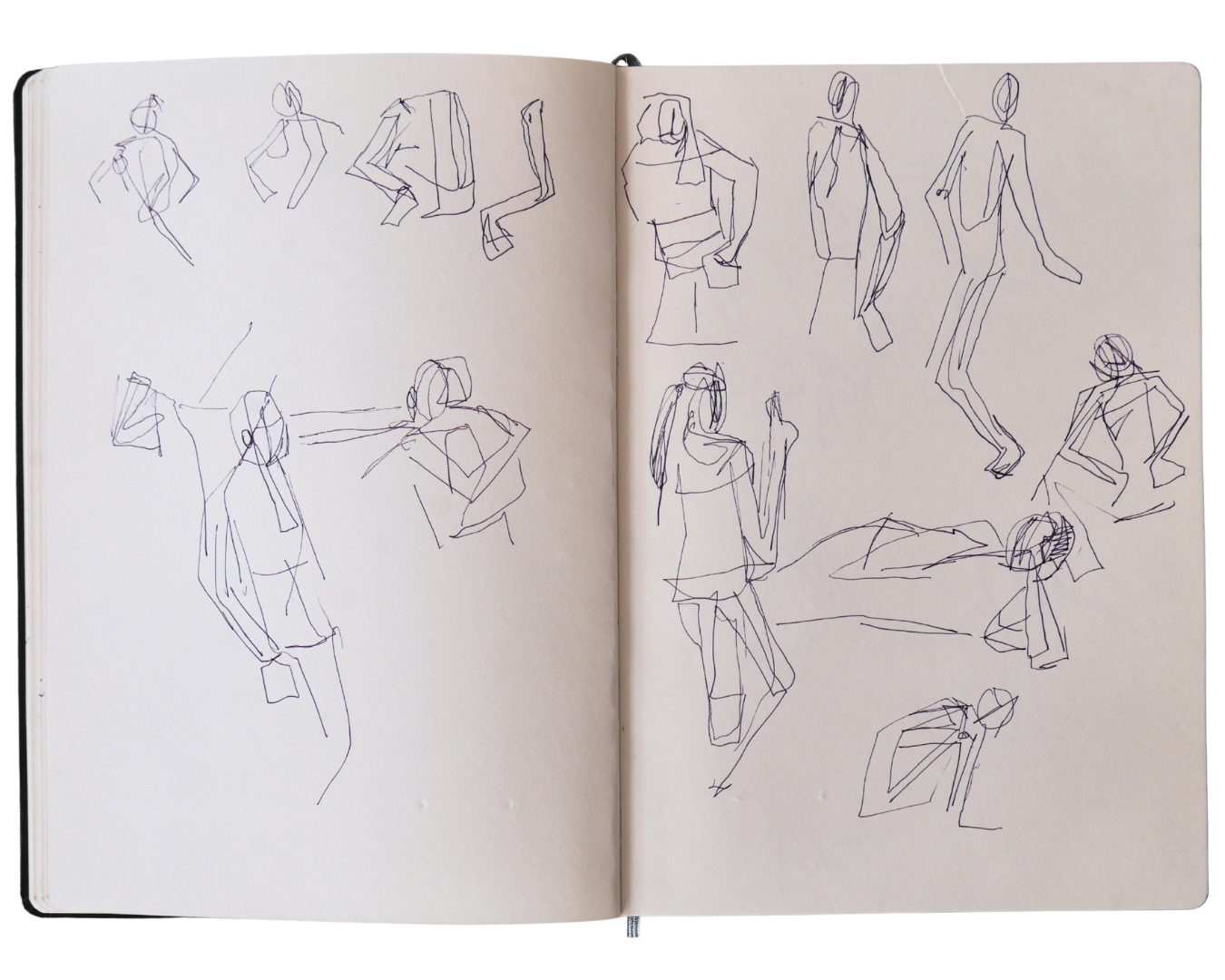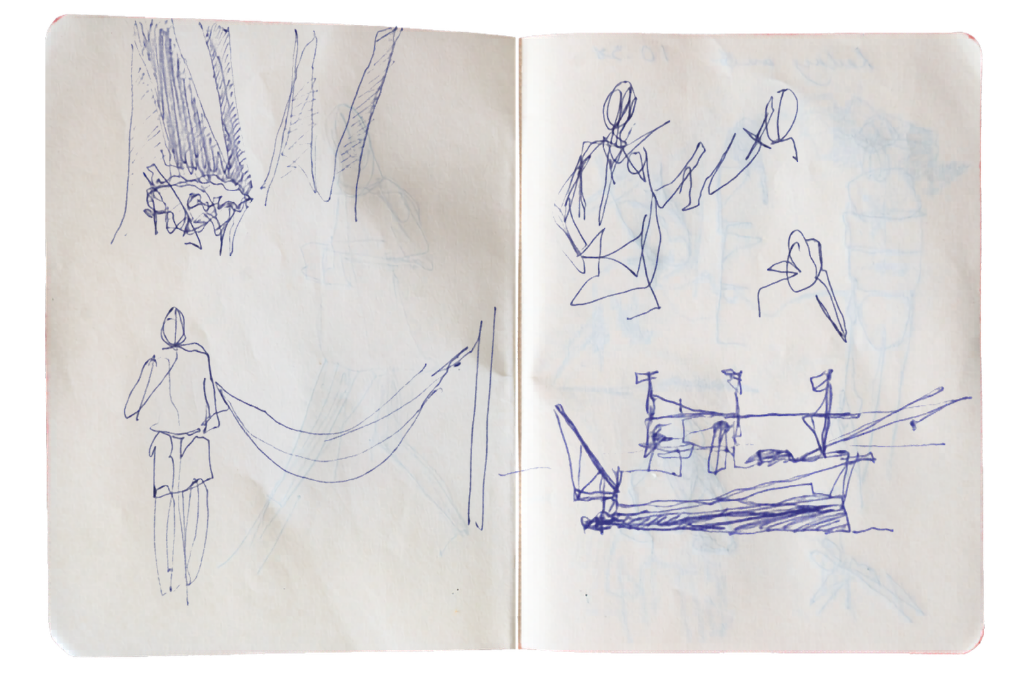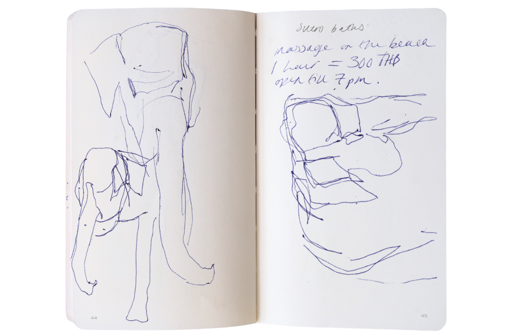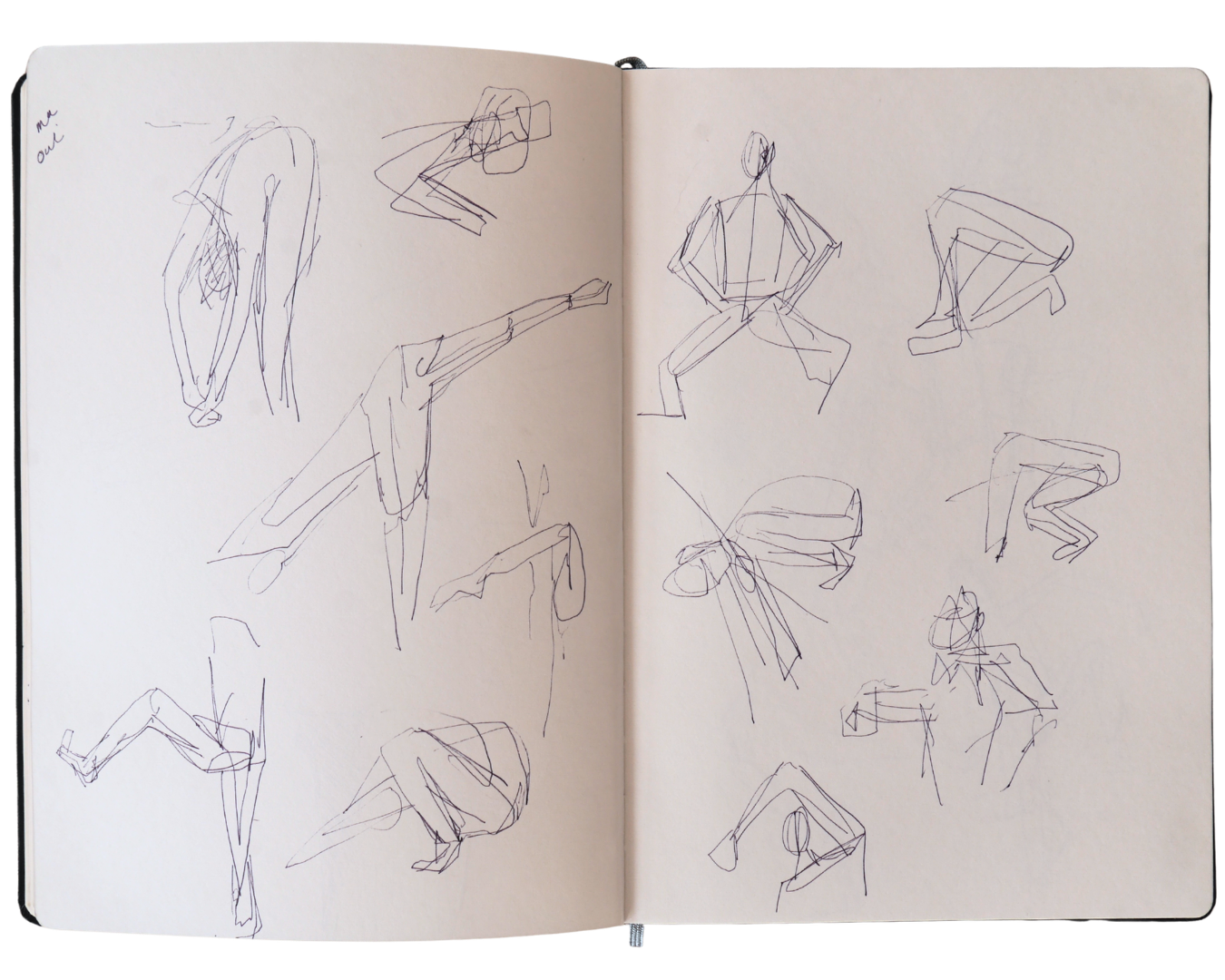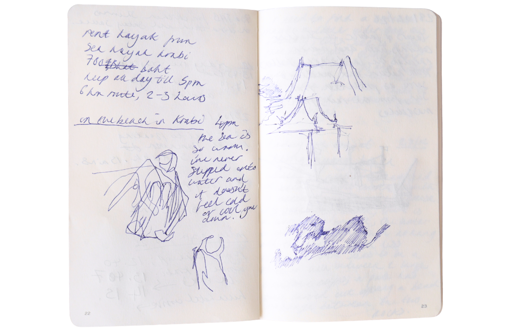 Visiting more places across the country, I drew inspiration from the landscape, culture, food, and customs. Exploring further afield from Bangkok ended up being just as fulfilling as the research project for me to get a better idea of how these elements of dance, theatre and ceremony are visible throughout Thailand. I enjoyed observing traditional Thai massage, something usually only conducted in private spaces, being a communal experience along the coast and in shared rooms. You can see glimpses of my thoughts through my travel sketchbook below.