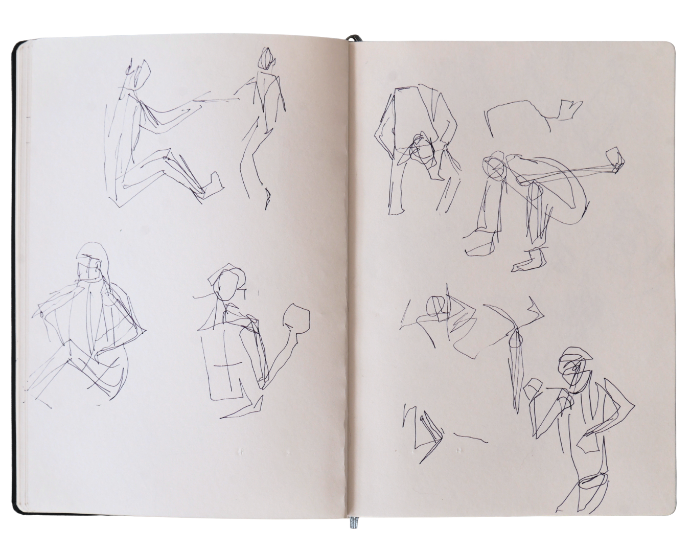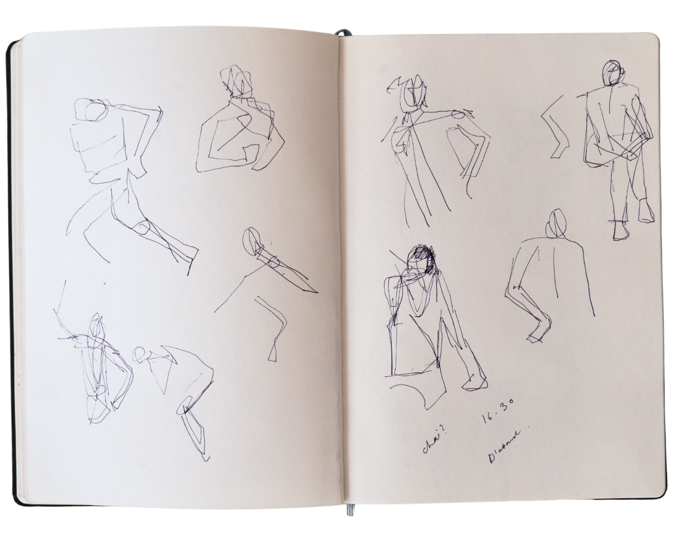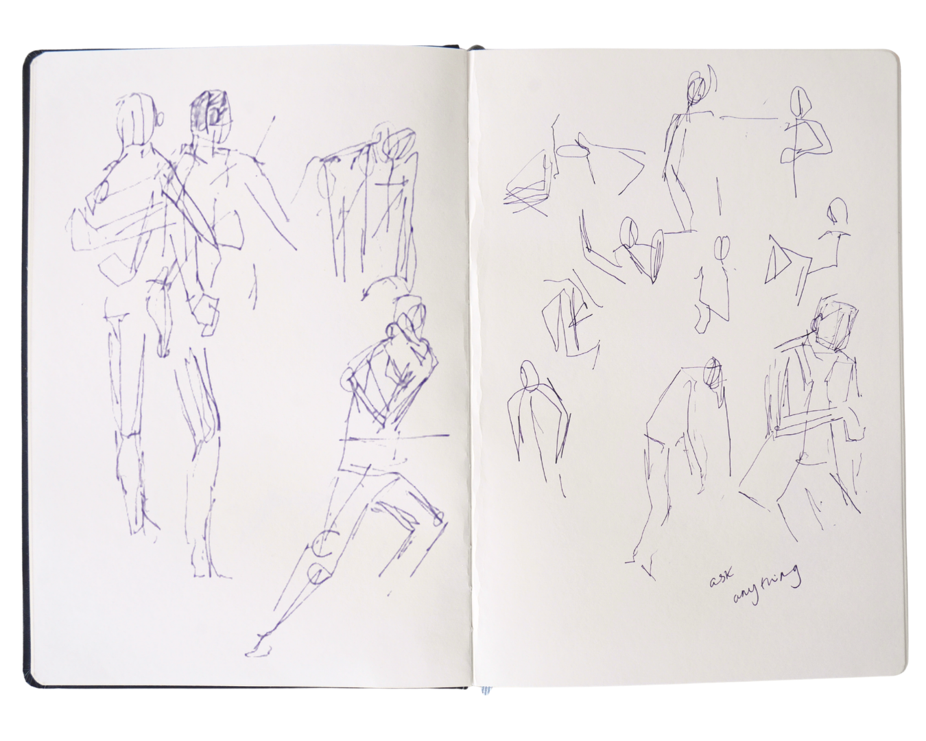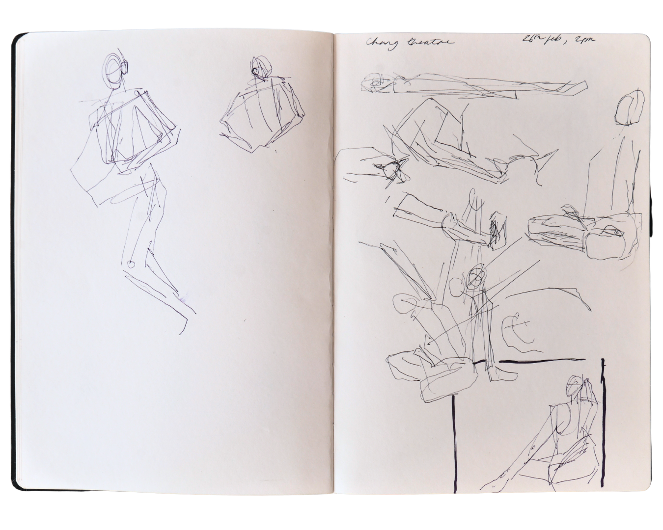 During my time in Bangkok, I was able to watch a variety of performances by the company and discuss some of the themes of their work. performances took place in Bangkok Kunstalle, a modern art centre in Bangkok’s Chinatown. The last session was held at the change theatre, PKDC’s official home and rehearsal space, where they were putting the final touches on a revised production. You can see drawings from all three sessions below.
